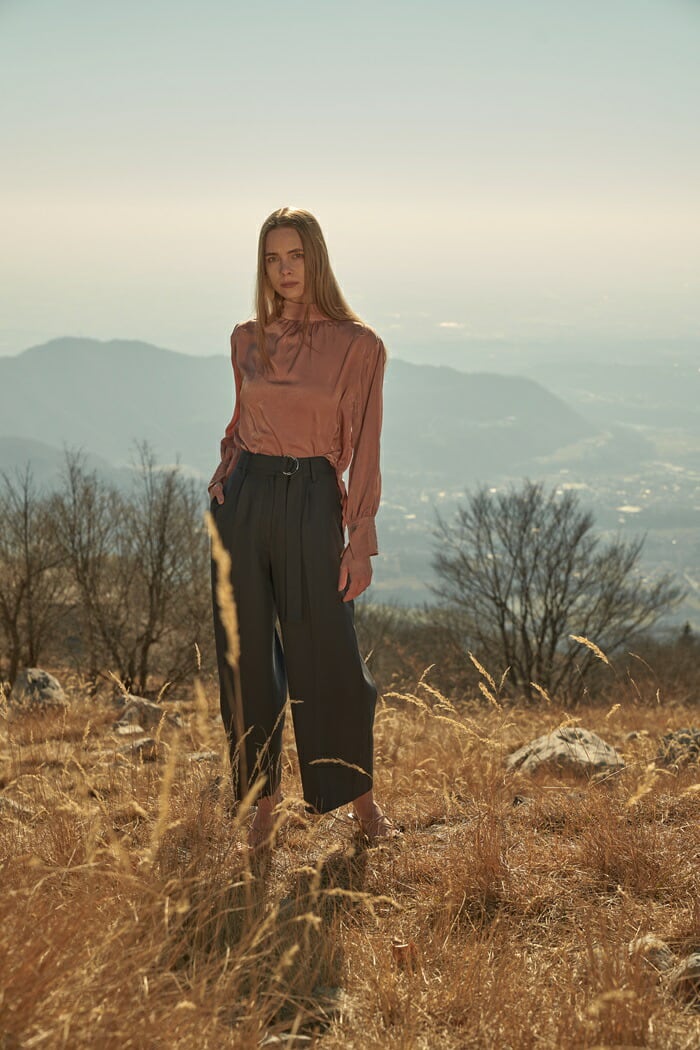 ・ポリエステルのサテンを微起毛タッチに仕上げている。やや薄手でしなやかなドレープ性があり、ウォーム感とベルベットのような光沢感が特徴の素材。