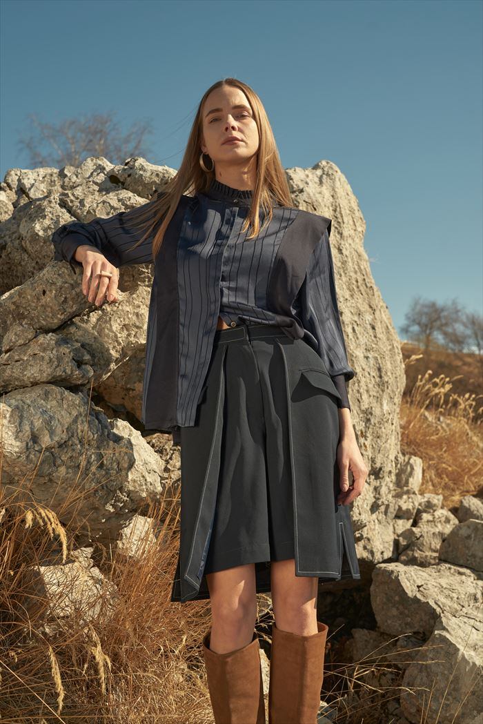 ・ショートパンツにタイトスカートの印象を与えたレイヤードデザイン。