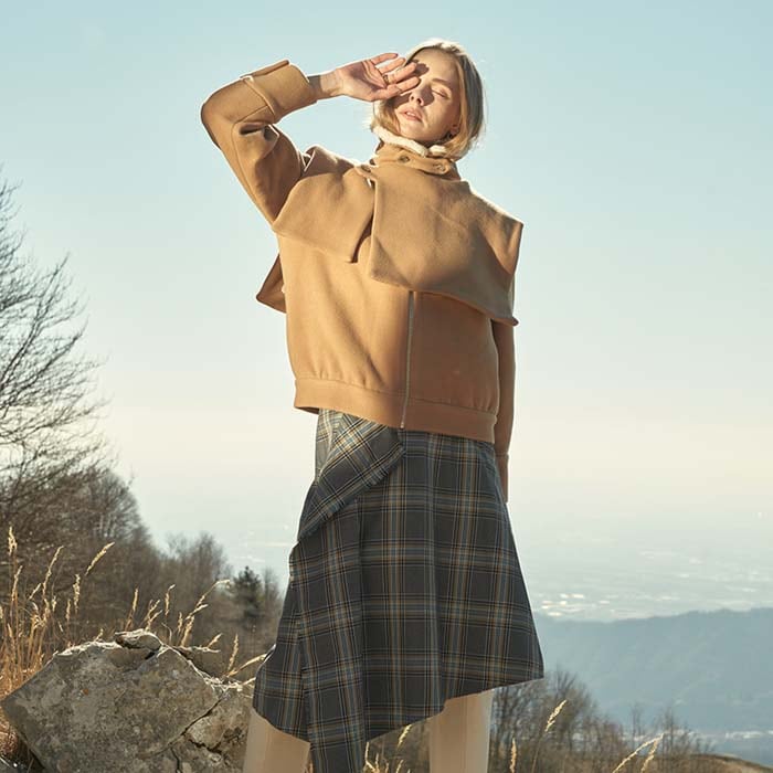 ・フェミニンな印象から、襟を立てればマチュアな仕様に2WAYが楽しめる。