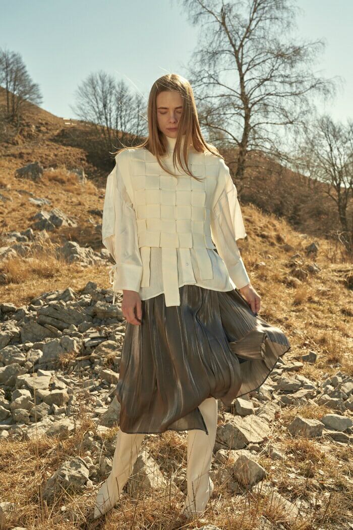 ・不規則なプリーツ幅と巻きスカート風のシルエットがマチュアな印象。