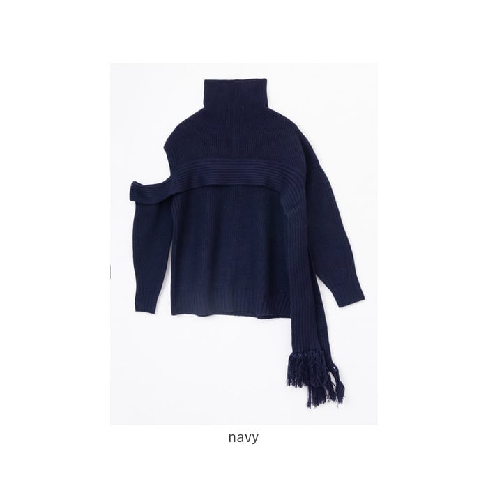 ・マフラーを巻いているようにゆったりと垂らして着用するコージースタイルのセーター。片方の袖はヘルシーな肌見せが出来るカットアウトデザインで、ふわふわのフリンジがアクセントに。