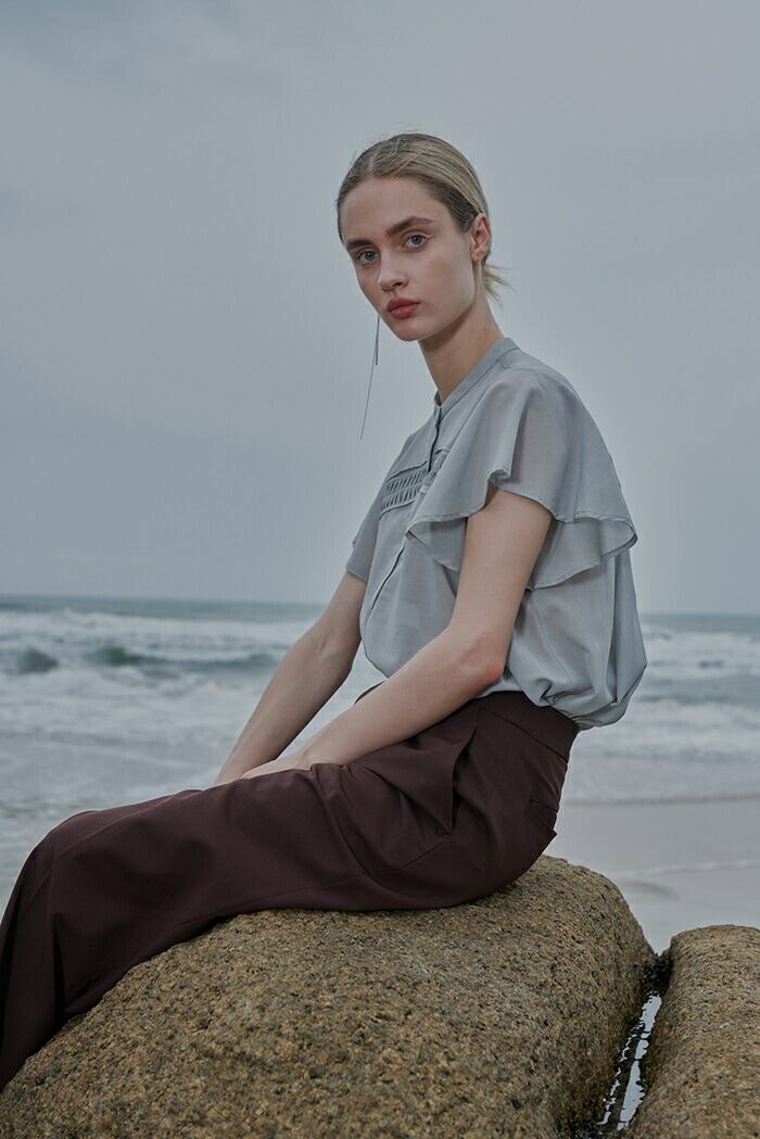 ・光の当たり方や角度次第で色の表情が変わるバンドカラーブラウス。