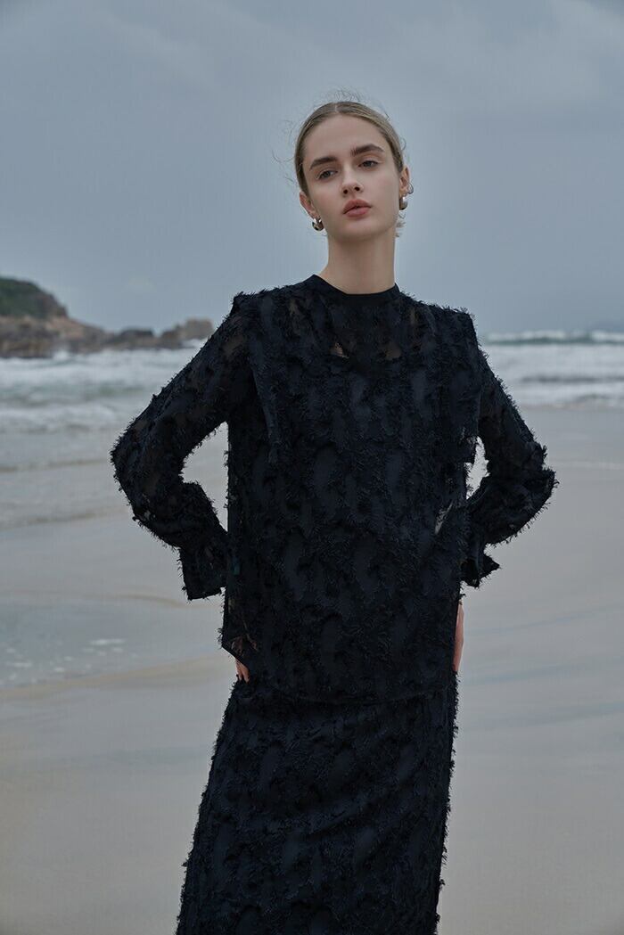 ・立体感のあるジャガードに目を惹く華やかさを加え、ドレス生地のように仕上げたペイズリー柄ブラウス。