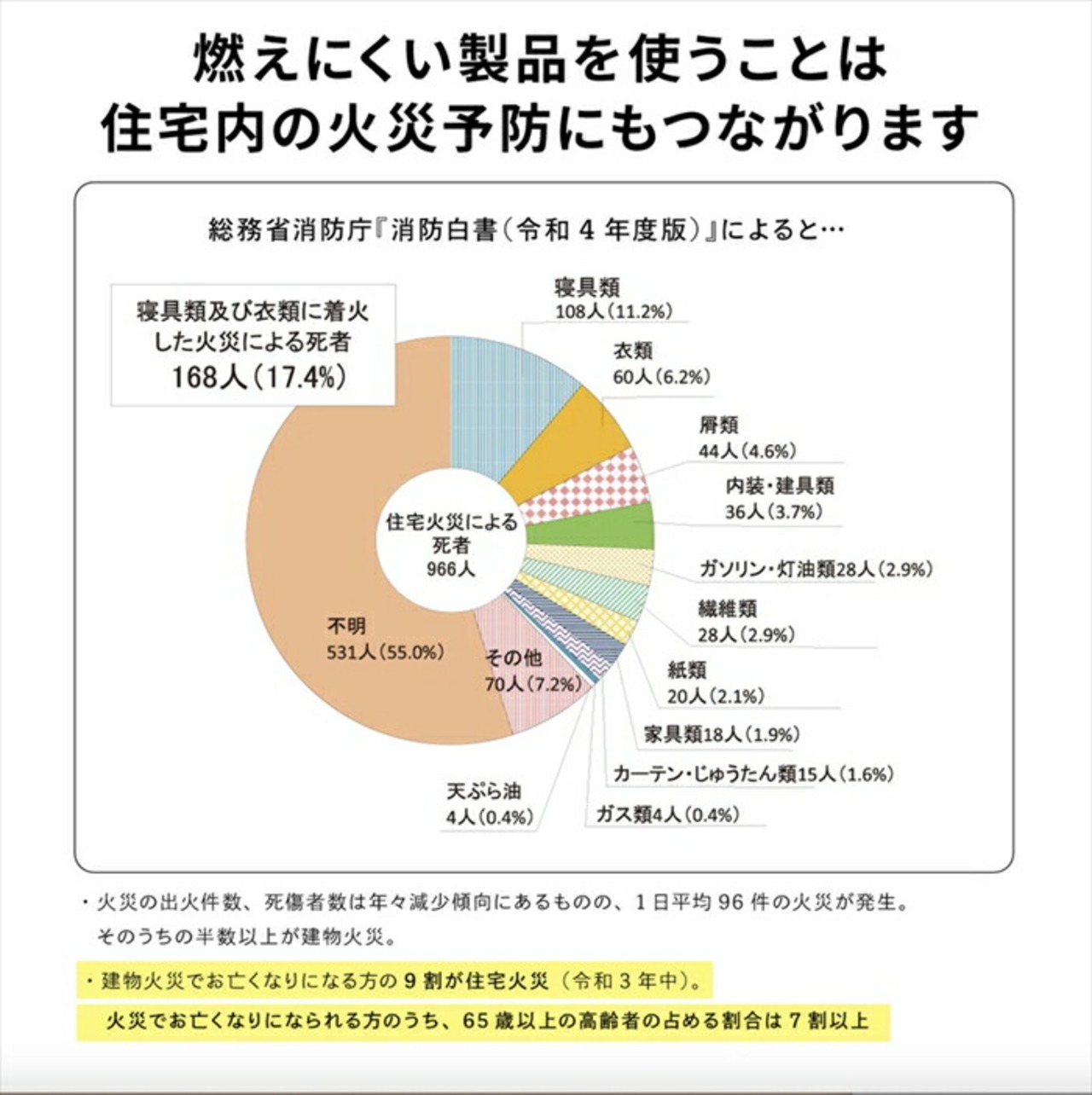 ・燃えにくい製品を使うことで、自分・家族・周りの人を守ることに役立ちます。