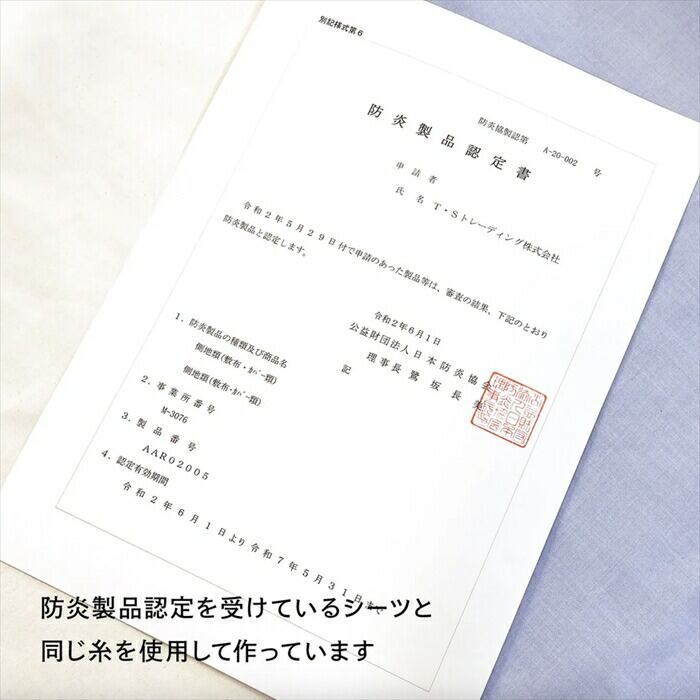 ・タオル生地に使用している紡績難燃糸と同じ糸で編み立てたシーツ生地は、公益財団法人日本防炎協会の防炎認定を受けています。