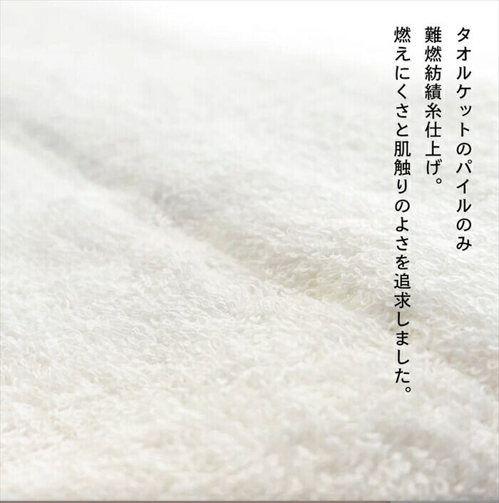 ・標準装備の燃えにくさはもちろん、綿100%のタオルのような質感で、吸汗性とやわらかさもあります。