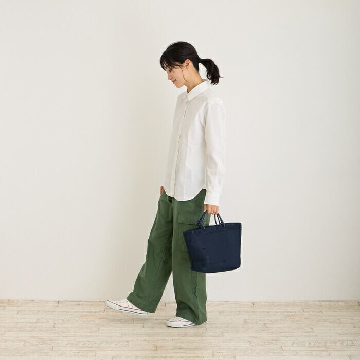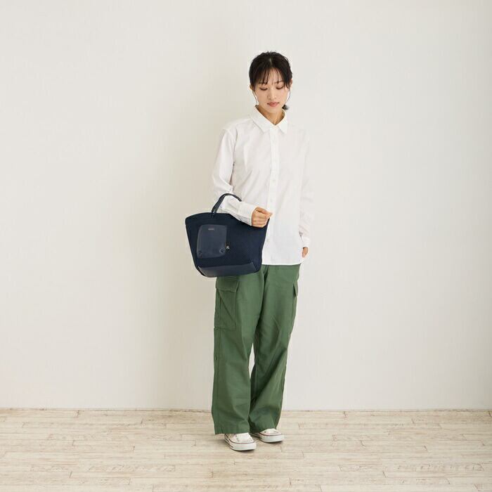・フェイクレザー底で、しっかり安定・自立するつくり。ドットボタン開閉で、中身を隠せて安心です。