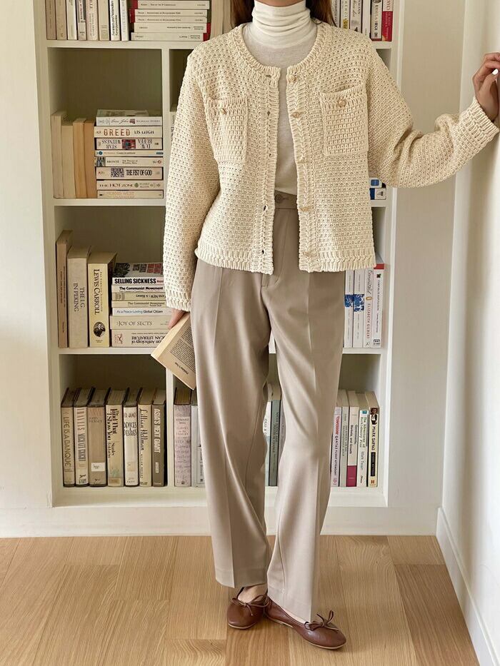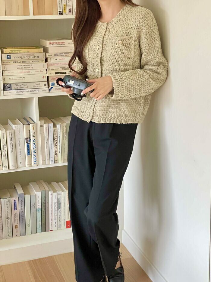 ・上品で洗練された着こなしが即叶う、ノーカラーのツイードカーディガンジャケット。