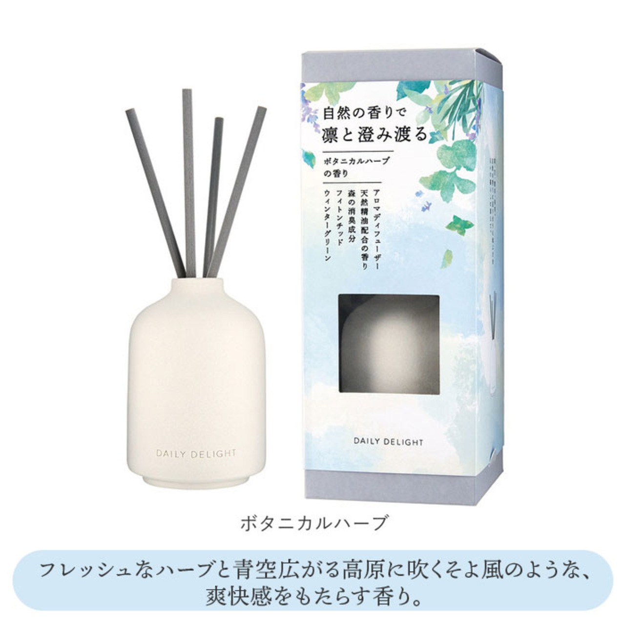 ・ボタニカルハーブ…フレッシュなハーブと青空広がる高原に吹くそよ風のような、爽快感をもたらす香り。