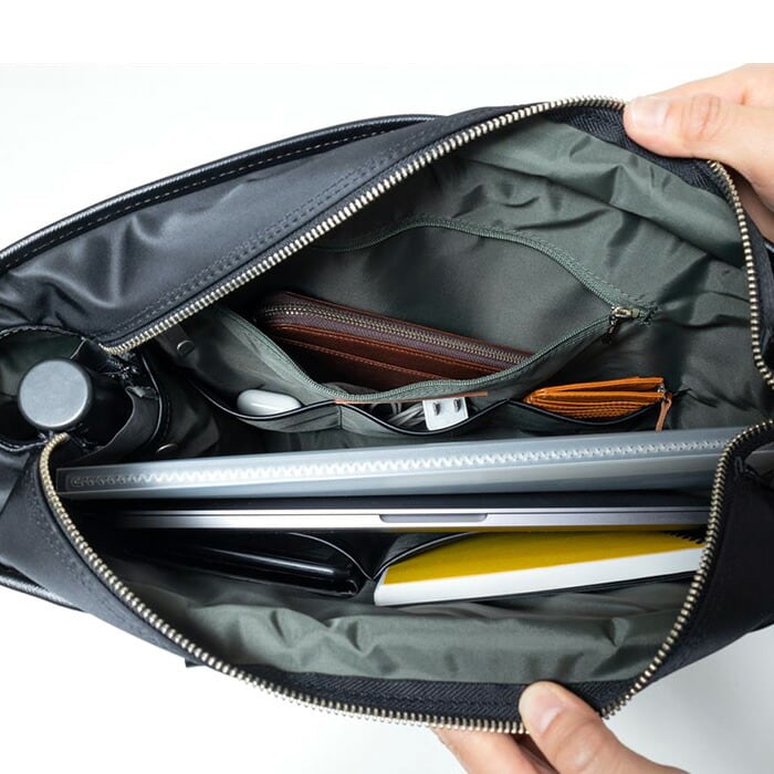 ・本体使用ナイロンは弱撥水、生地裏にPVC加工を施しているので、水に濡れても中まで水が染み込みにくくなっています。