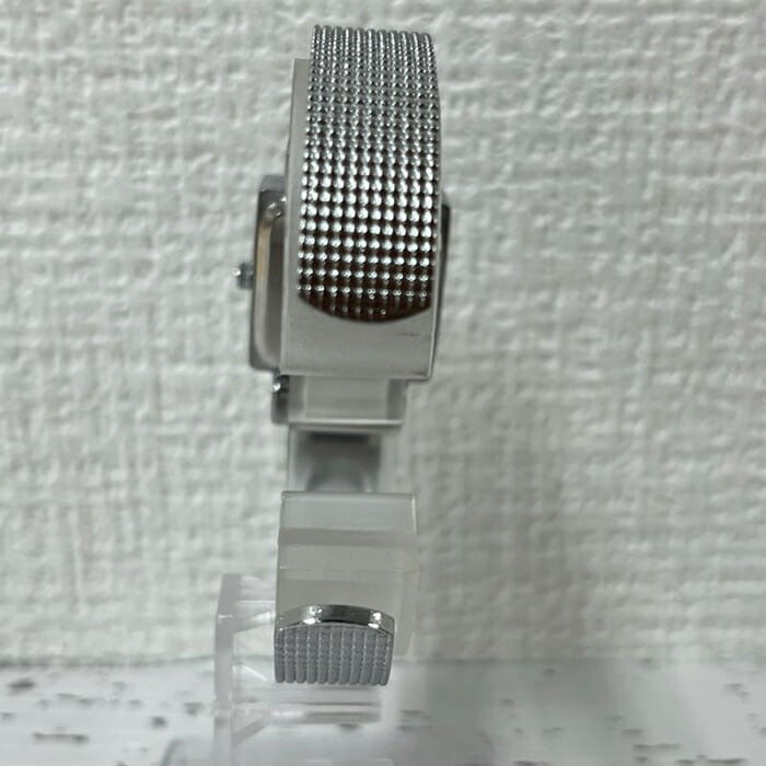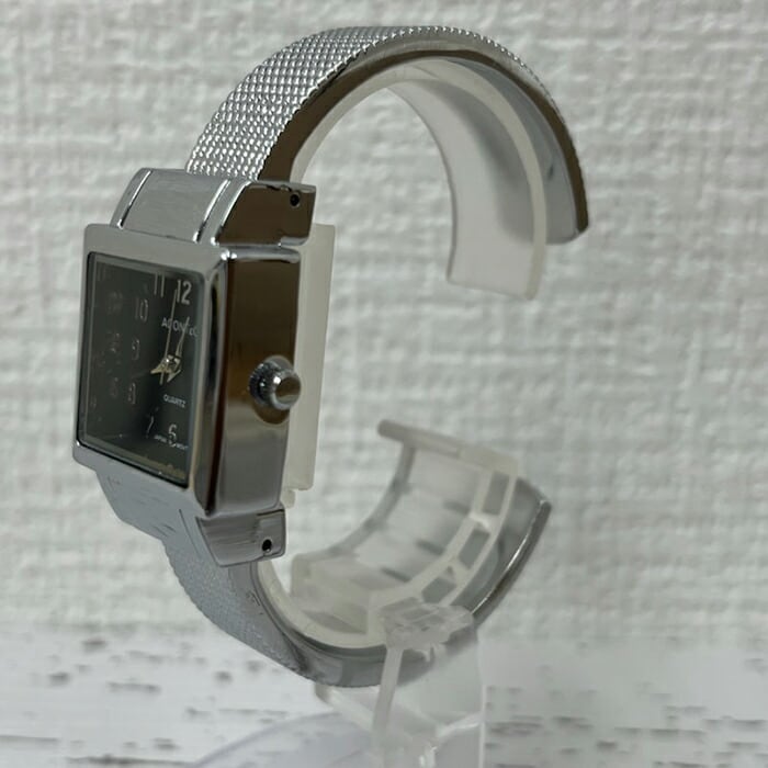 ・可愛い小ぶりの角型バングル時計。数字はハッキリ見やすく、付け心地も腕にフィット。バングル部分がモザイク柄になっているのでマット系のアクセサリーとピッタリ。