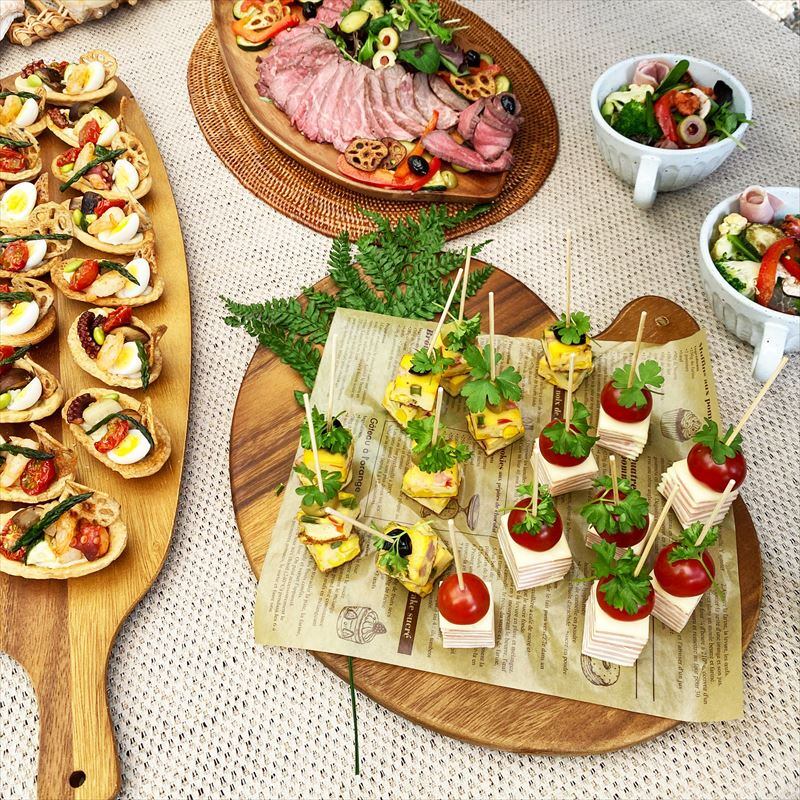 ・鍋やフライパンをそのまま置いたり、ピザやパン、チーズやサラダをそのままのせるだけでも、見た目も華やかなパーティー仕様に見えるサービングボードです。