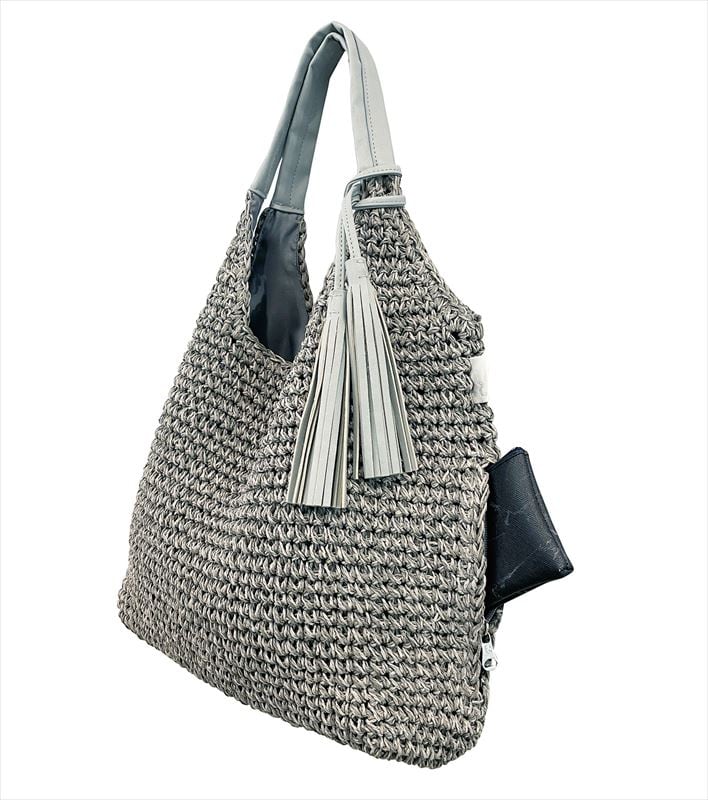 ・体にフィット!肩掛けもしやすい形状。持ち手にはフェイクレザーを使い、上品な仕上がり。肩に掛けても手に持ってもバランスの良い長さになっています。ペーパー素材を使用しているので、柔らかく、お気に入りのお洋服に引っかかることなく使えます。ゆらゆら♪大きめのタッセルチャームがポイントです。