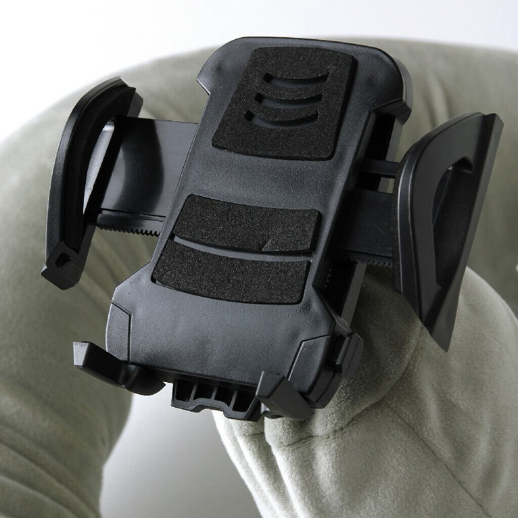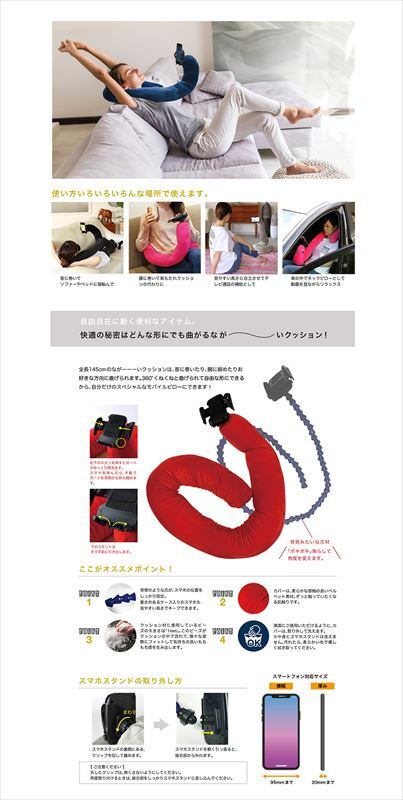 ・全長145cmの長いクッションは首に巻いたり、腕に絡めたり、デスクに置いたり固定ができ、先端に付いているスマホホルダーにスマホをセットして、ハンズフリーで楽しむことが可能。