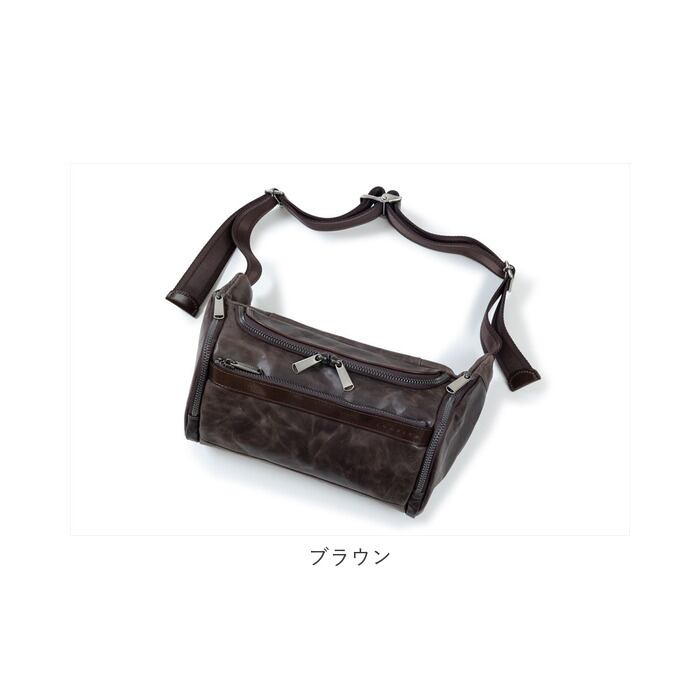 ・メイン素材にプルアップさせた(折り曲げたりすると独特な濃淡やシワが現れる)牛革、附属には深みと透明感のある牛ヌメ革を使用した、横型ボディバッグです。