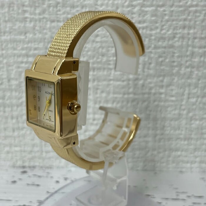 ・可愛い小ぶりの角型バングル時計。数字はハッキリ見やすく、付け心地も腕にフィット。バングル部分がモザイク柄になっているのでマット系のアクセサリーとピッタリ。