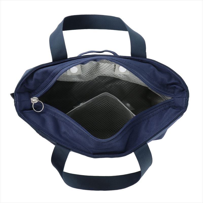 ・内側メッシュポケットは反対側のホックで留めて宙吊りポケットにできます。吊りポケットに凍らせたペットボトルを入れて、上からの位置で保冷することもできる便利なつくり。トップファスナーがついているので、中身がこぼれ落ちる心配もありません。クッション性があり、安心して持ち運べます。