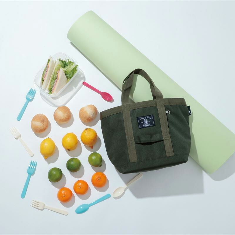 ・簡易保冷機能付きルートート「サーモキーパー」。お弁当、飲み物、デザートの持ち運びにちょうどいいランチサイズ。少人数でのピクニックにもピッタリ。2段のランチボックスやデザート、500mlのペットボトルもスッキリ納まります。