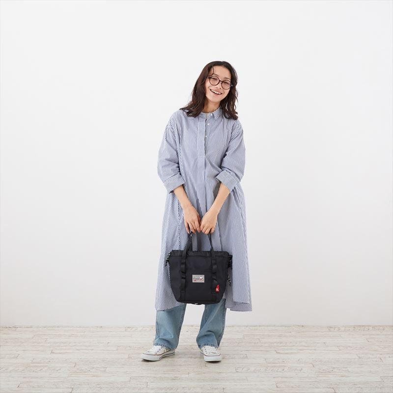 ・パリッとした軽いポリエステル本体に、下部から持ち手につながるテープ使いが特徴です。