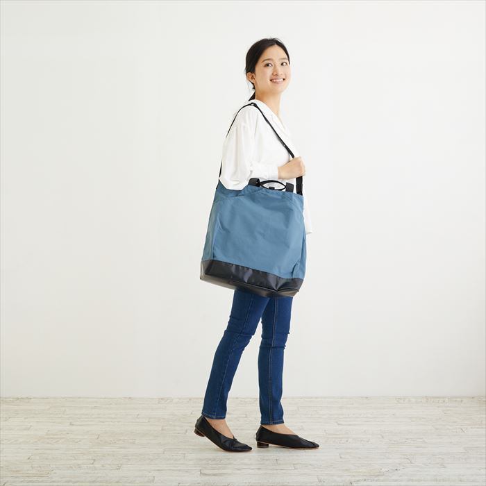 ・汚れや水滴に強いターポリンを底面に、ハリ感のあるナイロンを本体に使用したユニセックスなショルダー付トートバッグ。
