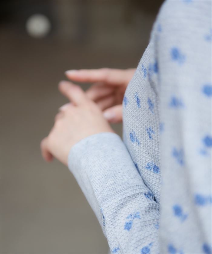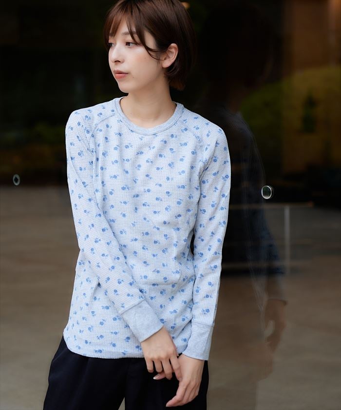 ・定番ワッフル素材にトリコロールカラーの花柄プリントが魅力的なワッフルラグランロンT。