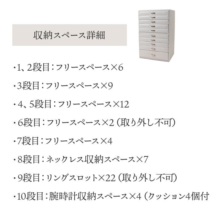 ・9段目にはリングスロット、10段目にはクッション付きの腕時計収納とフリースペース。