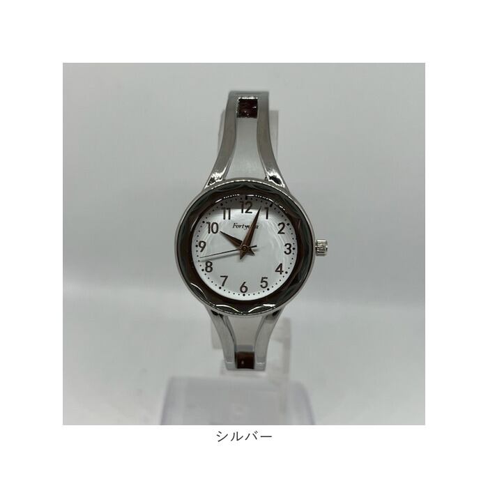 ・カットガラスが可愛いバングル時計。スタイリッシュなデザインで軽くつけやすい。文字盤がホワイトで数字も針もとっても見やすい。