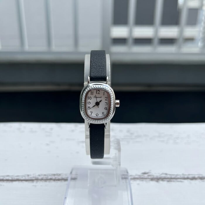 ・あまり見かけない長丸タイプの小さめ時計。1分ごとのメモリもついており黒い数字・黒い針でとっても見やすい。ベルトも8mm幅と細く目立ちすぎない仕様。