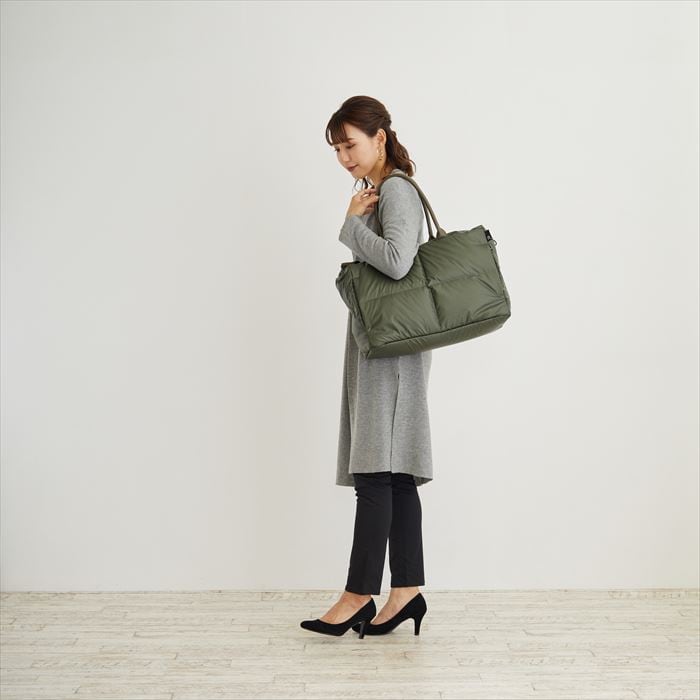 ・スタイリッシュなきれいめキルティング。羽毛のインナーで仕上げた軽〜いトート。