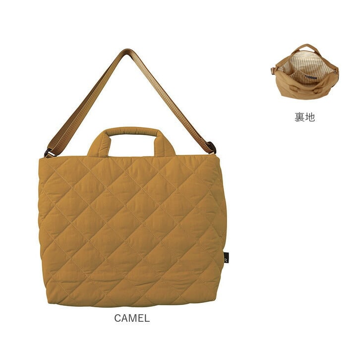 ・軽くて丈夫なナイロン生地に、菱形(ダイヤモンドシェイプ)キルティング加工を施しました。中綿入りで布地にプクッと立体感が出て、おしゃれでかわいい仕上り。