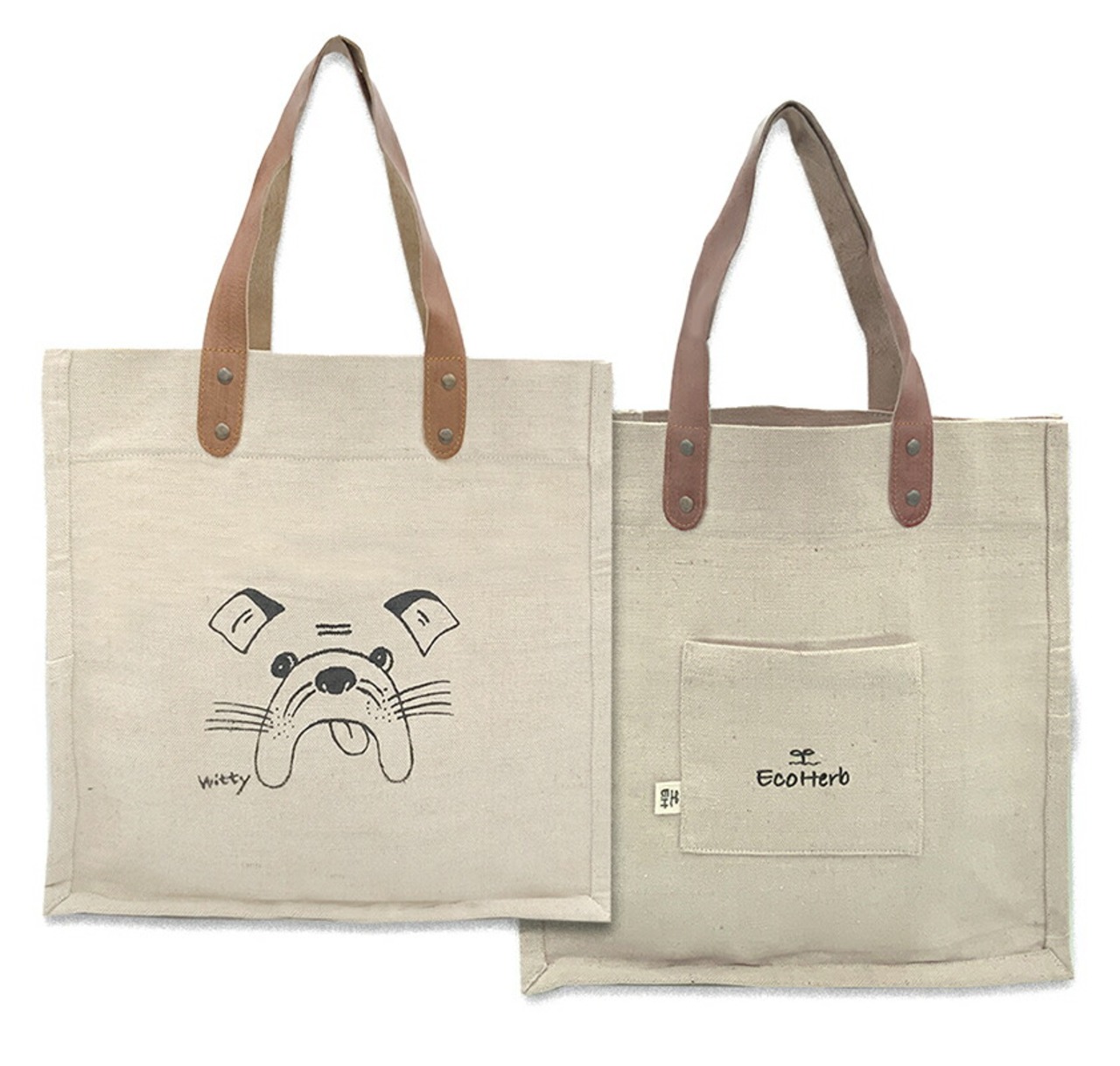 ・書類が入れられるトートバッグをしっかりしたジュートコットンで作り、[witty]シリーズの犬柄をプリントしました。