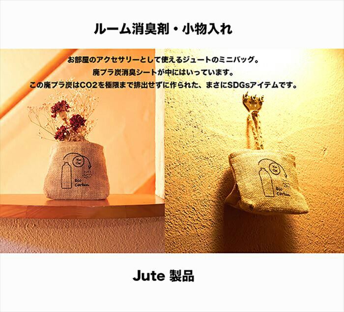 ・防臭・防虫効果があるジュート素材のミニバッグの中に抗菌・防臭効果の高い廃プラ炭(活性炭)シートを入れたお部屋飾りとして使える消臭ルームアクセサリー。