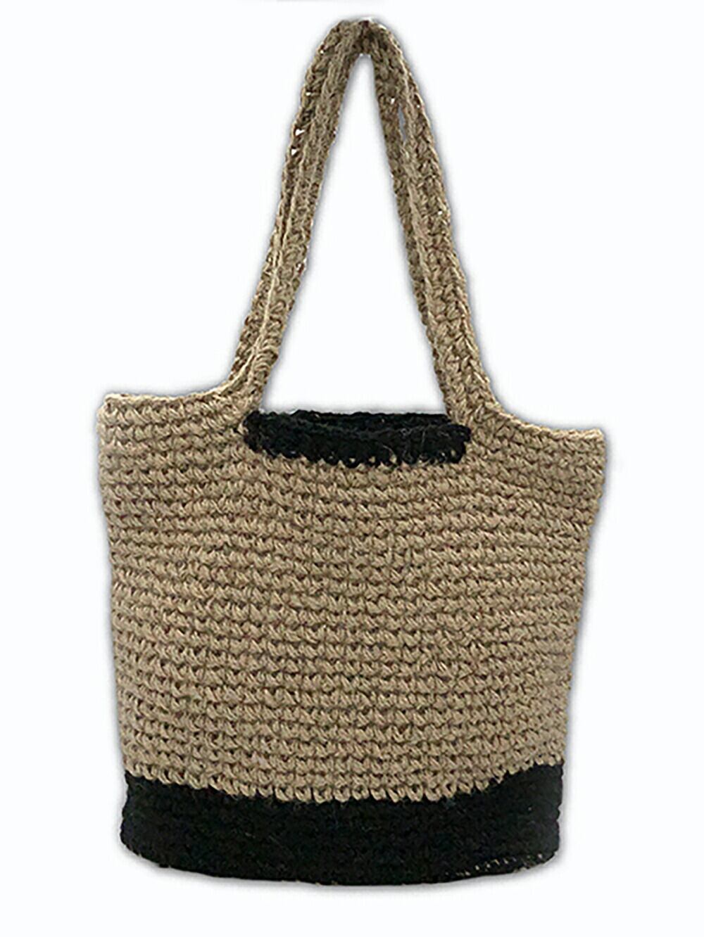 ・ジュートヤーンのかぎ針あみトートバッグ。手編みの温もり感とパッチの手作り感がマッチしたキュートなバッグ。