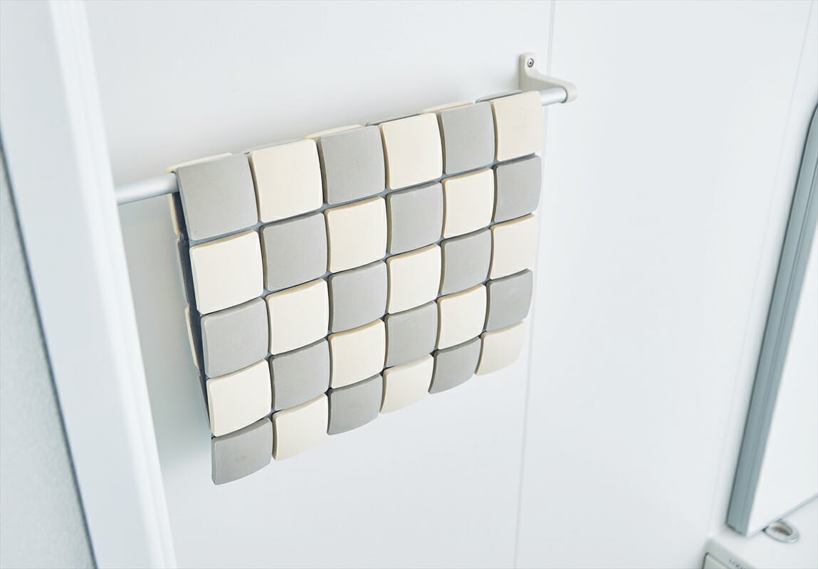 ・従来の珪藻土バスマットでは考えられなかった、タオルハンガーに掛けて乾かすこともできます。(※耐荷重1.5kg未満のタオルハンガーには掛けないでください。)