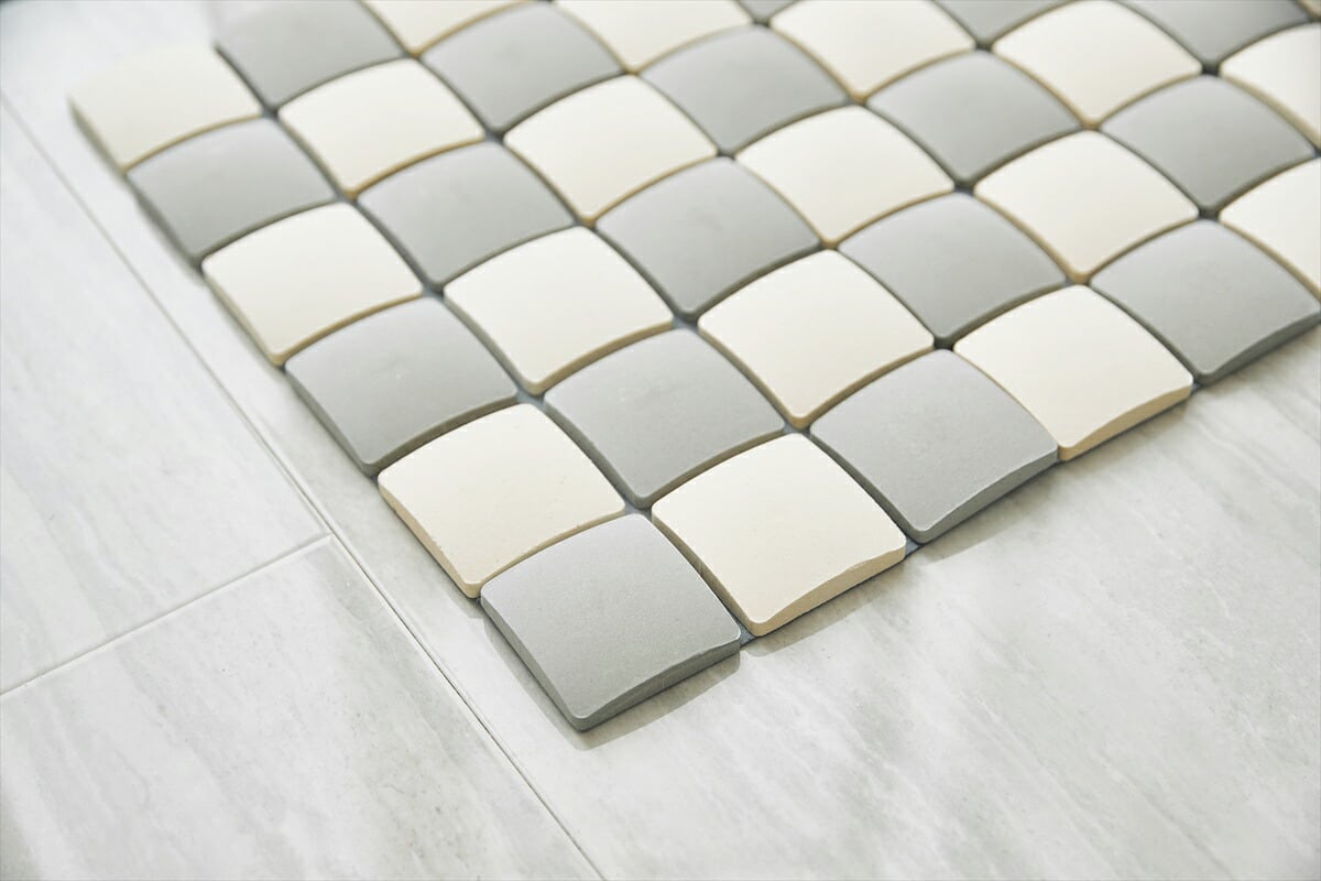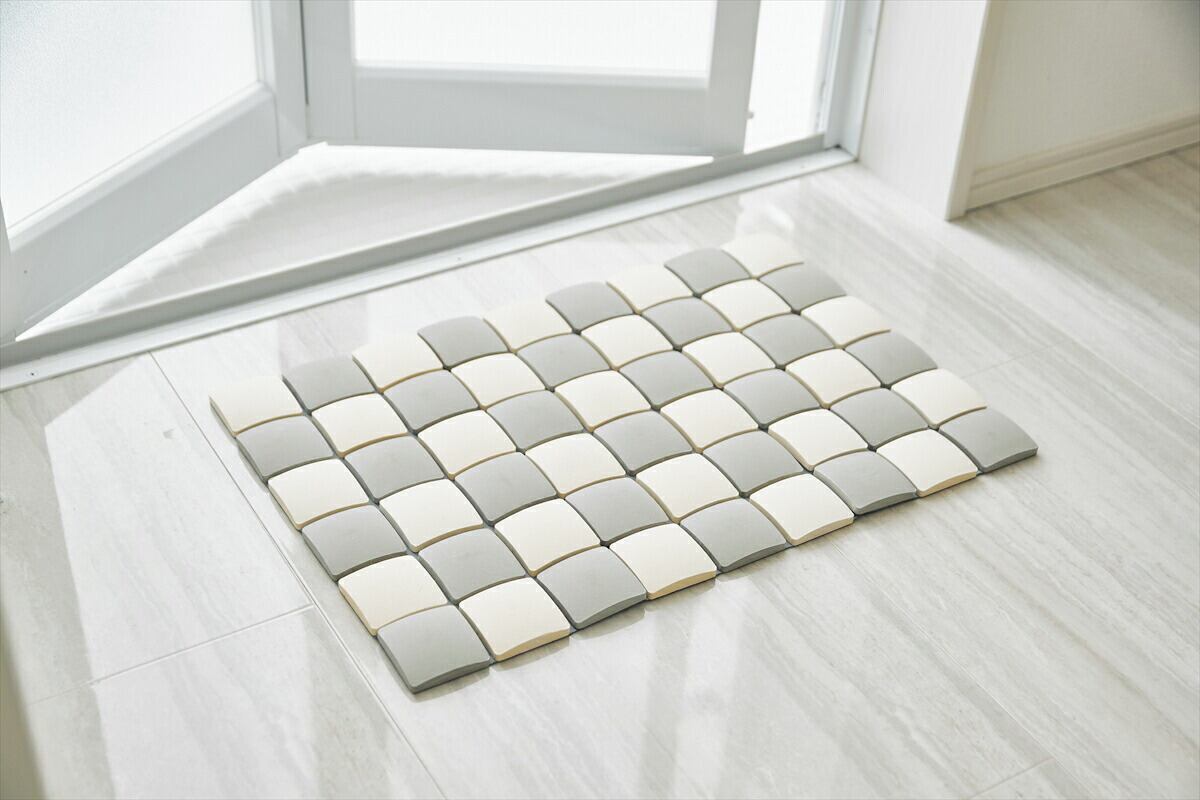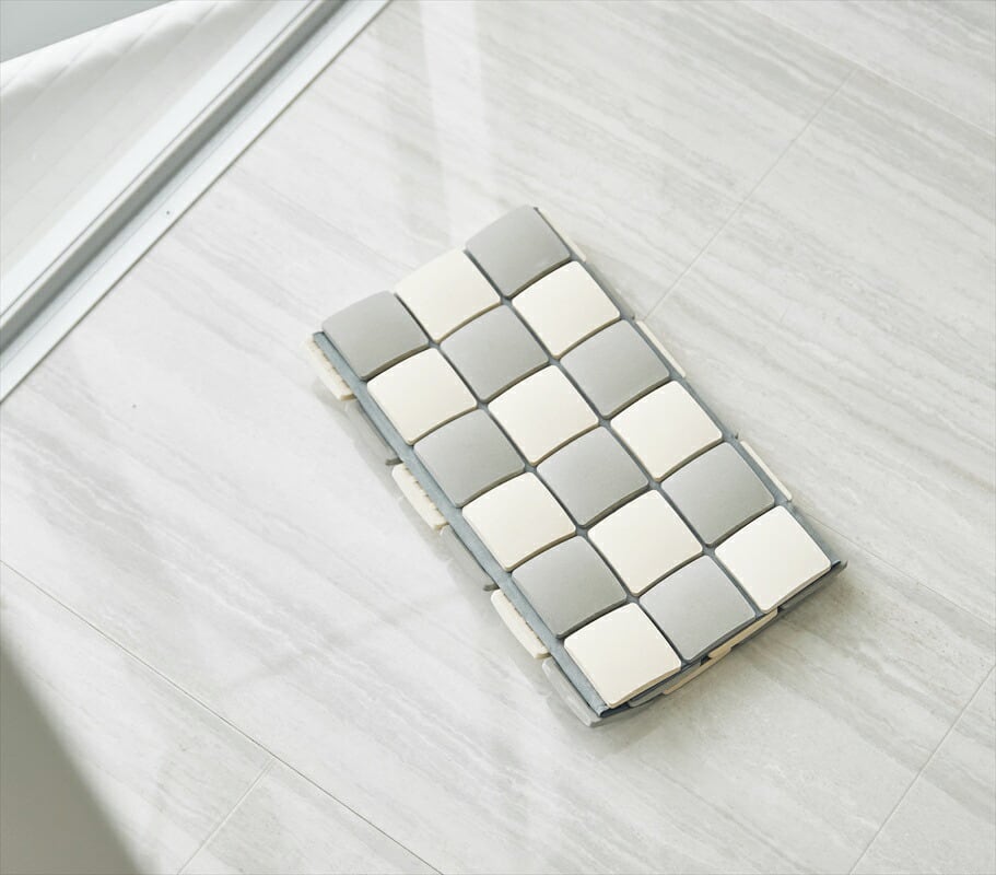 ・さらに正方形のタイル一つ一つを丸みのある表面に仕上げることで1枚板の珪藻土バスマットの弱点であった、土踏まずの部分にもフィットし足の裏全体の水分を素早く吸い取ってくれます。