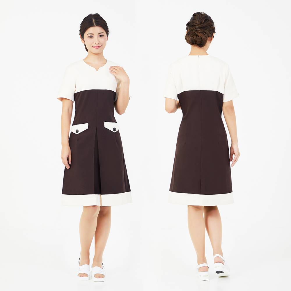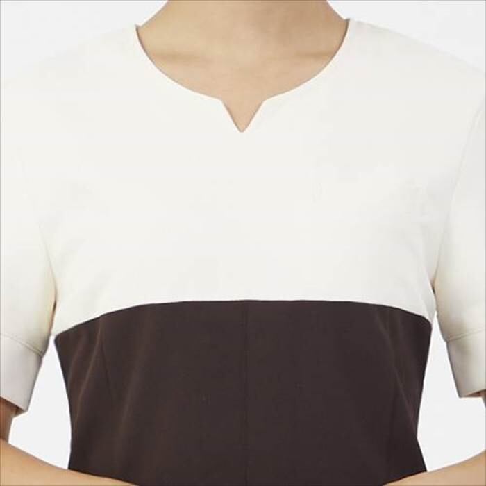 ・バイカラーとバスト部分のライン切り替えでウエストラインを高く、シャープですっきりとスタイルアップを演出。