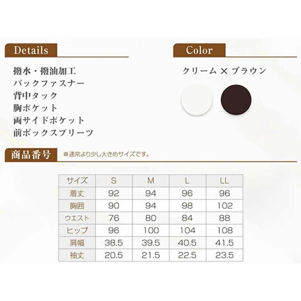 ・撥水・撥油加工に優れオイル染みしにくい生地は汚れにくく、長く着用いただけます、前ボックスプリーツで足さばきがよく動きやすい機能性もプラス。