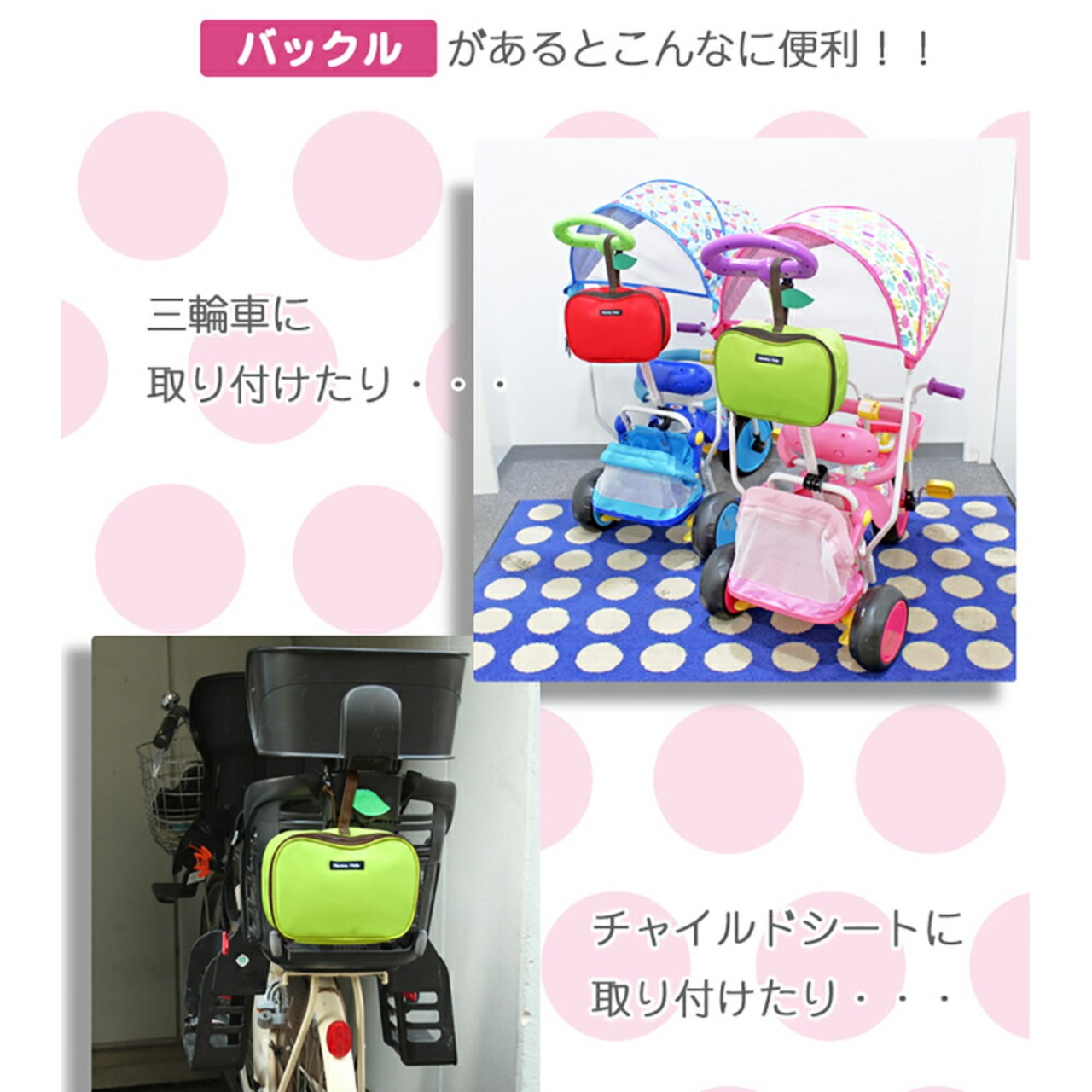 ・おしりふきやミニタオルも入る便利なポケット付き。バックル付きでベビーカーなどに引っ掛けられます。