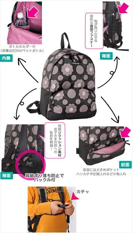 ・カラフルなHannaHulaベーシックパターンが魅力のキッズデイパック。軽くて丈夫な素材で、肩紐部分にアジャスターが付いているので、小さなお子さまから小学校低学年位まで長くお使い頂けます。内側にポケット・ボトルホルダー付。胸部分には肩からずり落ちないようにバックルが付いています。楽しい遠足やピクニックのリュックとしてはもちろん、通園やおけいこバッグにもお勧め!撥水加工済み。