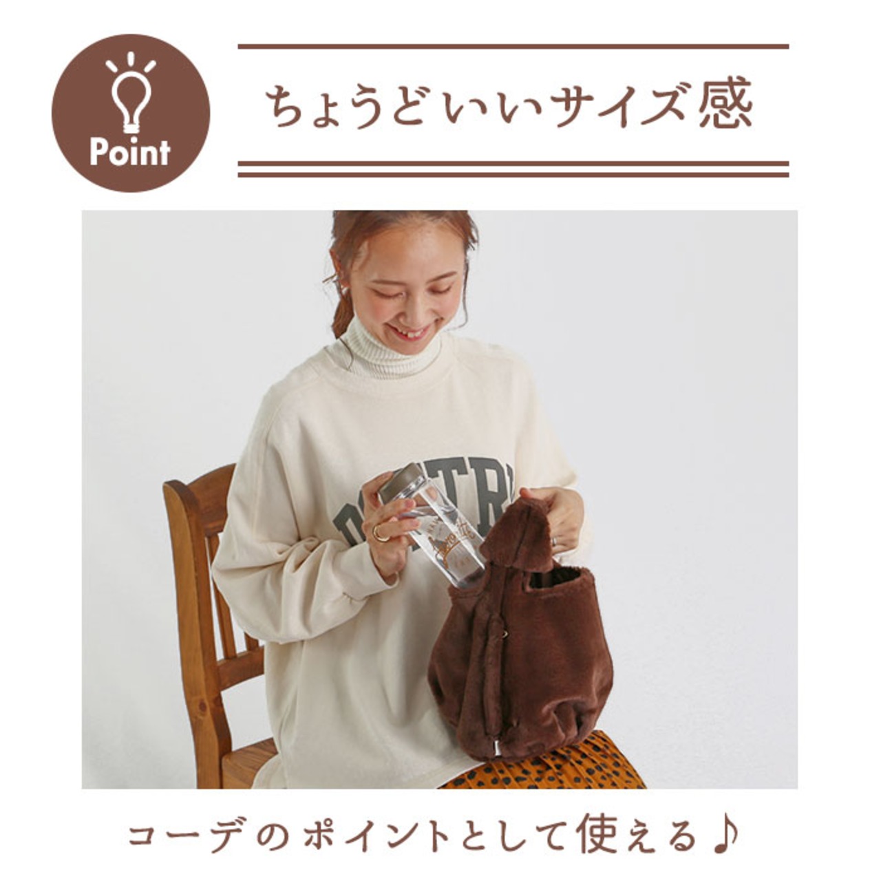 手触りの良いフェイクファーを使用し、撫でる度に癒され愛着のわく、コロンとしたフォルムと持ち手のリボンがかわいいミニトートバッグです。いろいろなファッションにポイントとして使えるアイテム。和装で持つのもおすすめ。