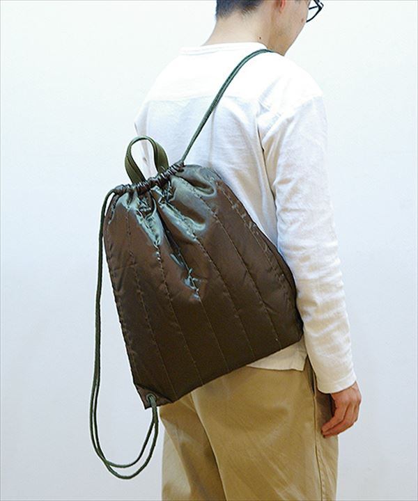 光沢のあるサテン生地にキルティング加工を施した、使い易さバツグンのナップサックタイプ。