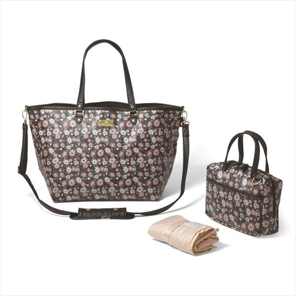 肩掛け、斜め掛けの 2WAY、内外に大小複数のポケット、同柄のおむつ替えシートにポーチ付き。
