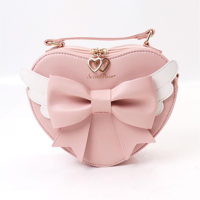 ・ハートのカバンに大きなリボンと羽を組み合わせた、フェミニンなショルダーバッグ。