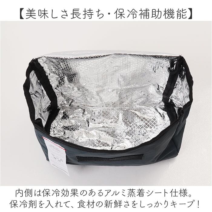 ・内側は保冷効果のあるアルミ蒸着シート仕様。保冷剤を入れて、食材の新鮮さをしっかりキープ!