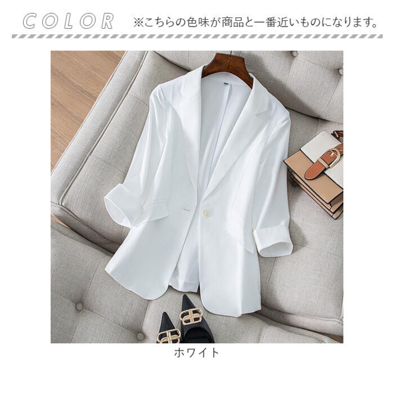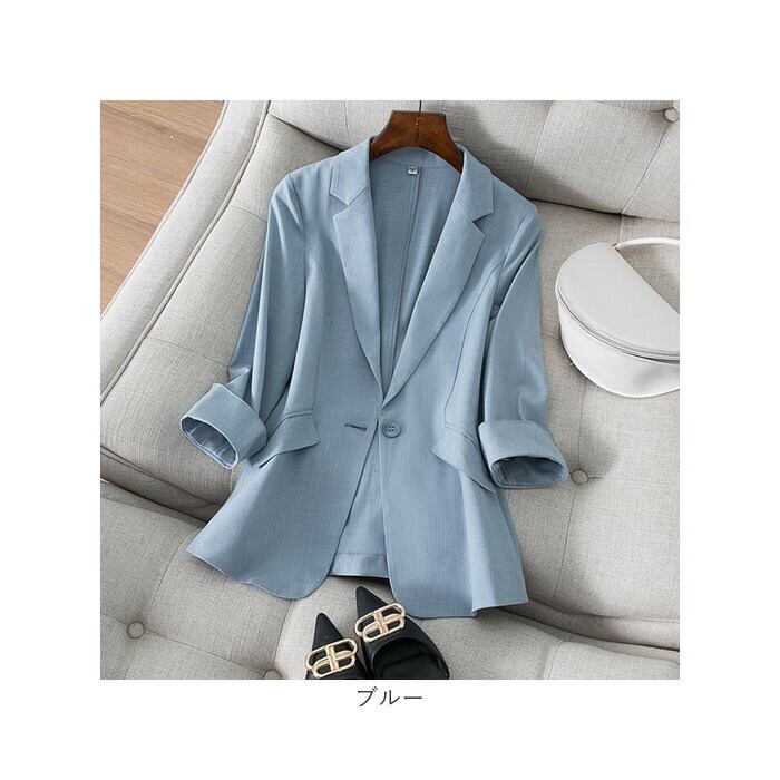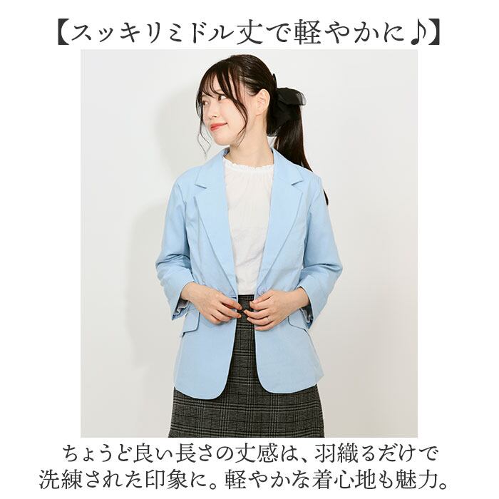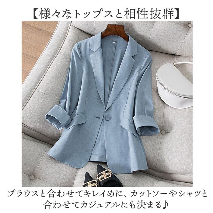 ・フロントにボタンを1つ配置したデザイン。女性らしさを引き立てる、折り返しの七分袖もアクセント。