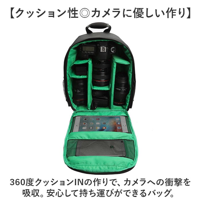 ・360度クッションINの作りで、カメラへの衝撃を吸収。安心して持ち運びができるバッグ。