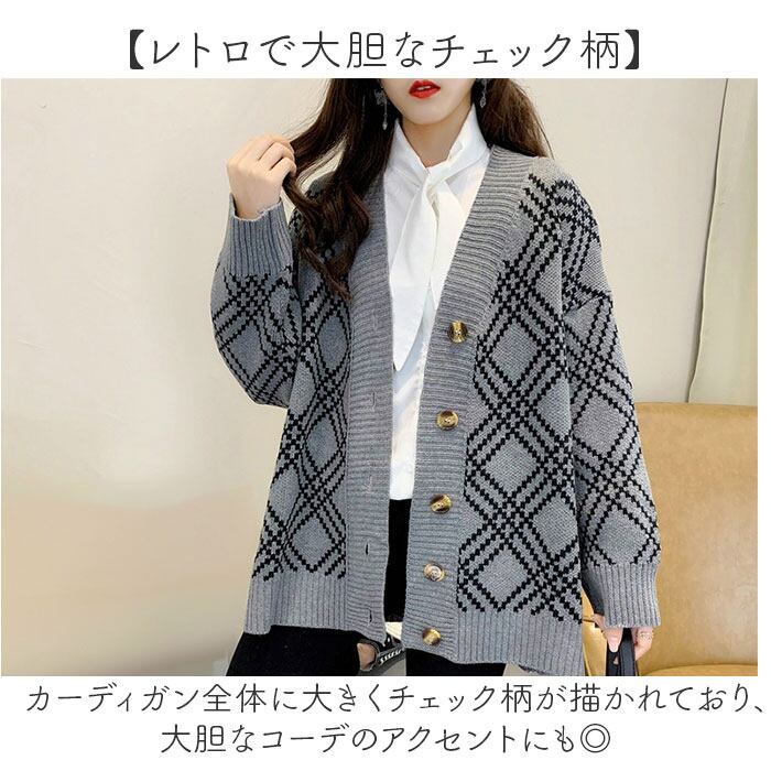 ・カーディガン全体に大きくチェック柄が描かれており、大胆なコーデのアクセントにも◎