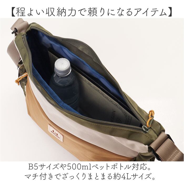 ・B5サイズや500mlペットボトル対応。マチ付きでざっくりまとまる約4Lサイズ。