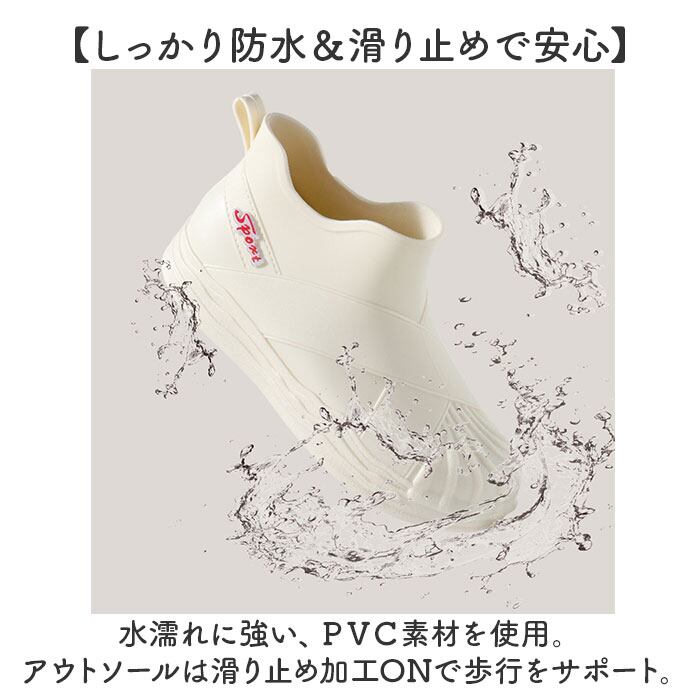 ・水濡れに強い、PVC素材を使用。アウトソールは滑り止め加工ONで歩行をサポート。