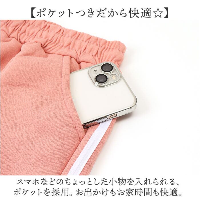 ・スマホなどのちょっとした小物を入れられる、ポケットを採用。お出かけもお家時間も快適。